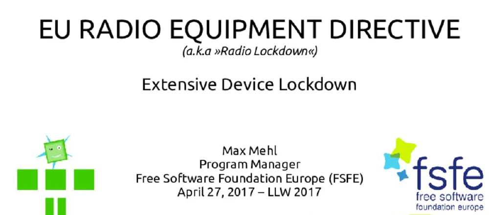 At the exclusive Legal and Licensing Workshop 2017, I presented on the EU Radio Equipment Directive and its potential for extensive device lockdown. The Legal and Licensing Workshop brings together legal professionals, compliance officers, and policy experts working on Free Software issues, making it the right audience for a detailed legal and technical analysis of this directive’s implications. The talk warned about how seemingly well-intentioned radio equipment regulations could be implemented in ways that fundamentally threaten software freedom on radio-capable devices.