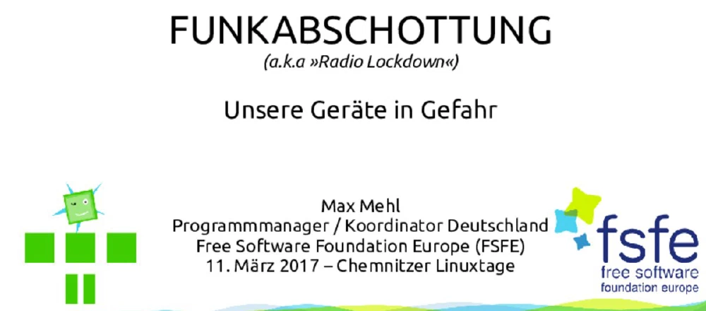 Bei den Chemnitzer Linuxtagen 2017 warnte ich vor der EU-Funkabschottungs-Richtlinie und ihren Auswirkungen auf die Freiheit unserer Geräte. Die Chemnitzer Linuxtage ziehen ein technisch versiertes Publikum an, das oft alternative Betriebssysteme nutzt, Router selbst konfiguriert und Wert auf Kontrolle über die eigene Hardware legt – genau die Praktiken, die durch diese Richtlinie gefährdet wurden. Der Vortrag machte deutlich, dass scheinbar abstrakte EU-Regulierung sehr konkrete Auswirkungen auf alltägliche technische Freiheiten haben kann.