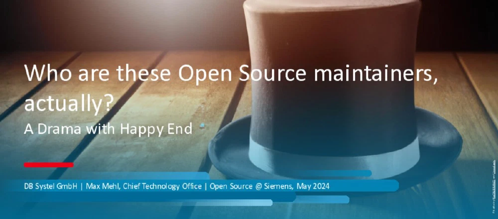 At Siemens Open Source 2024, I presented a narrative journey through the life of an Open Source maintainer, structured as a five-act drama with a happy ending. Through the story of “Alex”, a fictional developer, I explored what really drives maintainers, what they actually do beyond writing code, and the challenges they face when interacting with corporate structures. The talk moved from the initial motivation of creating a new tool driven by passion and intrinsic needs, through the growth into respected maintainership with community building responsibilities, to the eventual transition of passing on the role to ensure project sustainability.